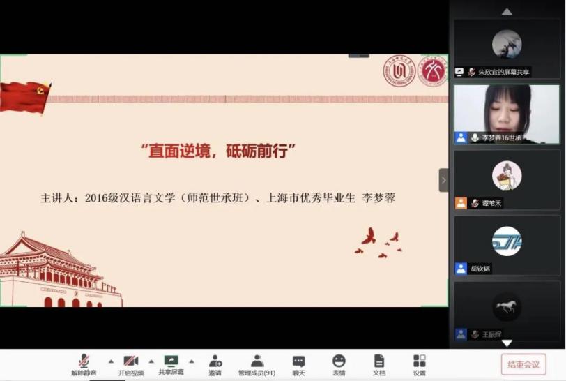 王振辉同学以“‘网络’重启下的‘尘封时光’”为主题,分享了自己在疫情期间如何利用身边资源、排除万难、勤奋学习的故事,三个“重启”即学习规划、志愿服务项目以及与学术泰斗朱瑞熙先生的对话,让参会同学深切体会到了王振辉同学在疫情期间“停课不停研”的钻研精神,使得这一段“尘封时光”变得充实而有意义。
