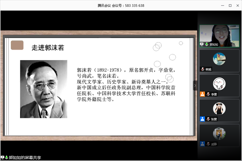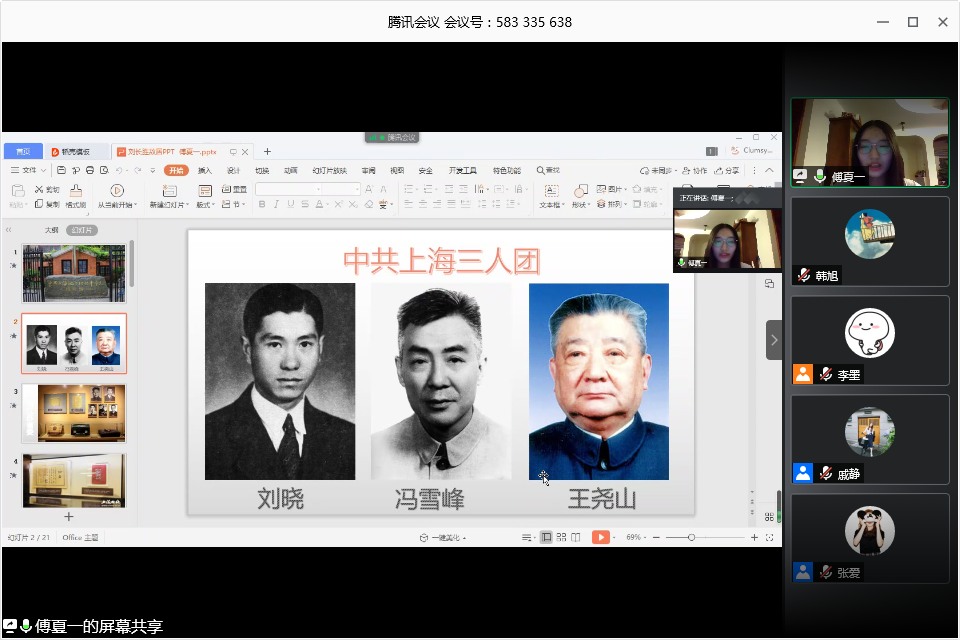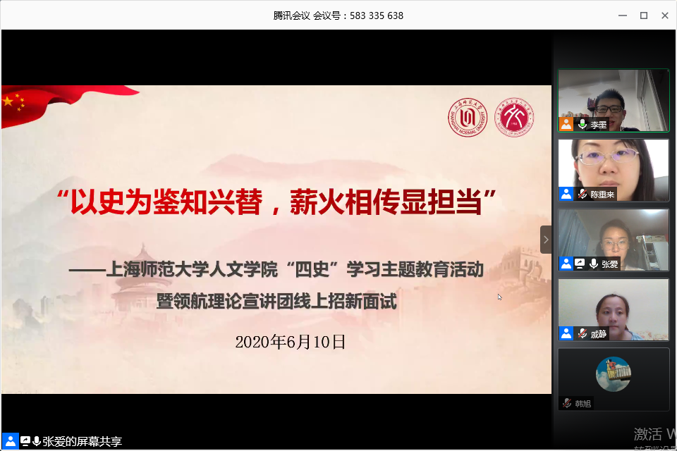 上海师大MK(中国)领航理论宣讲团于2020年6月10日晚7时举办“以史为鉴知兴替,薪火相传显担当”主题活动暨线上招新面试。学院党委副书记、副院长陈重来老师,学院组织员戚静老师,2019级本科生辅导员李墨老师以及兼职辅导员2018级中国古代文学专业研究生张爱担任本次线上招新选拔的评审,活动由李墨主持。