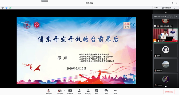 6月10日下午2点,人文学院领航讲堂首场讲座于文苑楼二楼人文礼堂举行。历史系教授、博士生导师邵雍做客领航讲堂作“四史”教育之《浦东开发开放的台前幕后》讲座。学院教师在会场中认真聆听,教工第四党支部结对支部——研究生院(部)党支部党员教师以及学院各教师党支部结对的2019级学生支部党员线上收听收看直播。讲座由学院副院长、教工第四党支部书记姚潇鸫教授主持。