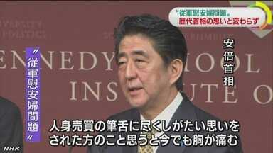 訪米中の安倍晋三首相は27日(現地時間)、ハーバード大学ケネディ行政大学院で講演し、旧日本軍の慰安婦問題に関する質問を受けると、「人身売買(human trafficking)の犠牲となって筆舌に尽くしがたい思いをした方々のことを思うと、今も私は胸が痛い」とし「この思いは歴代の首相の思いと変わらない」と述べた。また「河野談話について継承することは何回か申し上げてきた。このような立場から慰安婦の方々の現実的救済の観点から、様々な努力を積み上げてきた」と述べた。安倍首相は慰安婦被害者に対して謝罪せず、日本政府と軍が慰安婦問題に介入したことも認めなかった。