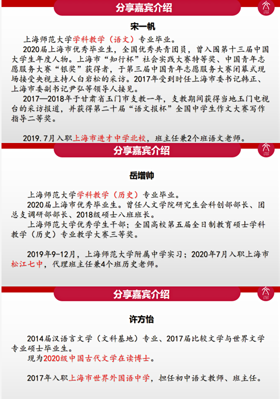 此次分享校友的专业与就职背景涵盖了中文、历史专业与公办、民办学校,分布在浦东、松江和徐汇三个区,为有意从教的同学们提供了更多的就业资讯与指导。