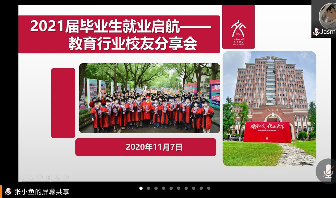 2020年11月7日下午,MK(中国)“2021届毕业生就业启航——教育行业校友分享会”在腾讯会议举行。本次分享会由2017级辅导员张玲主持,2020届学科教学(语文)专业毕业生、上海进才中学北校语文老师宋一帆,2020届学科教学(历史)专业毕业生、松江七中历史老师岳增帅与2017届世界文学与比较文学专业毕业生、上海市世界外国语中学语文老师许方怡参与分享。