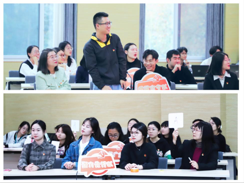 各参赛队伍积极团结、全心投入比赛,现场气氛既紧张又热烈。参赛选手在比赛中运用日常学习的积累,积极参与到每一环节比赛之中,“有问必答”环节展现了扎实的政治理论积累,“你画我猜”环节进行了两两默契考验,“听歌识曲”环节,在红歌中回顾了党和国家发展历程;“风险推理”环节,体验了惊心动魄的比分角逐。通过四轮比赛的“PK”,教工第一党支部党员教师余颖携2021级本科学生党支部党员戴越、学生生活园区第1党支部党员黄鑫雨和学生生活园区第19党支部党员赵宝洁,稳扎稳打、题题不落,精彩表现将现场彻底点燃,赞叹声在观众席中不断响起。