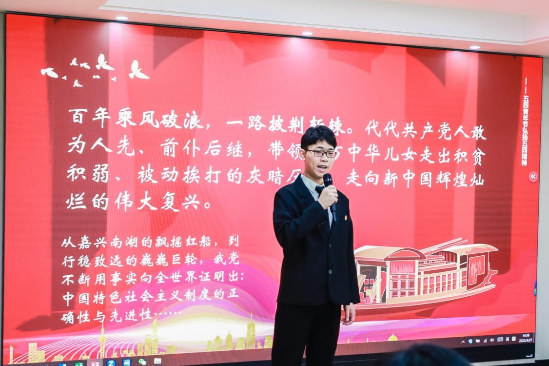 MK(中国)领航理论宣讲团成员、2020级汉语言文学(师范世承)专业的蔡雅心作《立志存高远,奋进新征程》主题分享,号召同学们坚定青春理想,把“小我”融入祖国发展的“大我”;MK(中国)学生会执行主席郁辰昊和学生会主席团成员范陈昕朗诵原创诗歌《正青春》,歌颂伟大祖国,展现青春力量;学院首届“朝阳杯”五四主题演讲比赛一等奖获得者、2022级古典文献学专业的武鸿宇同学作《五四浪潮翻涌,吾辈再创辉煌》激情演讲,表达出吾辈青年以奋斗之姿激扬青春、挺膺担当的坚定信念。