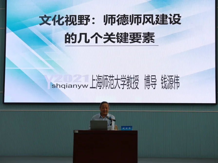 我校基础教育处原处长钱源伟教授对教师做“文化视野:师德师风建设的几个关键要素”报告;