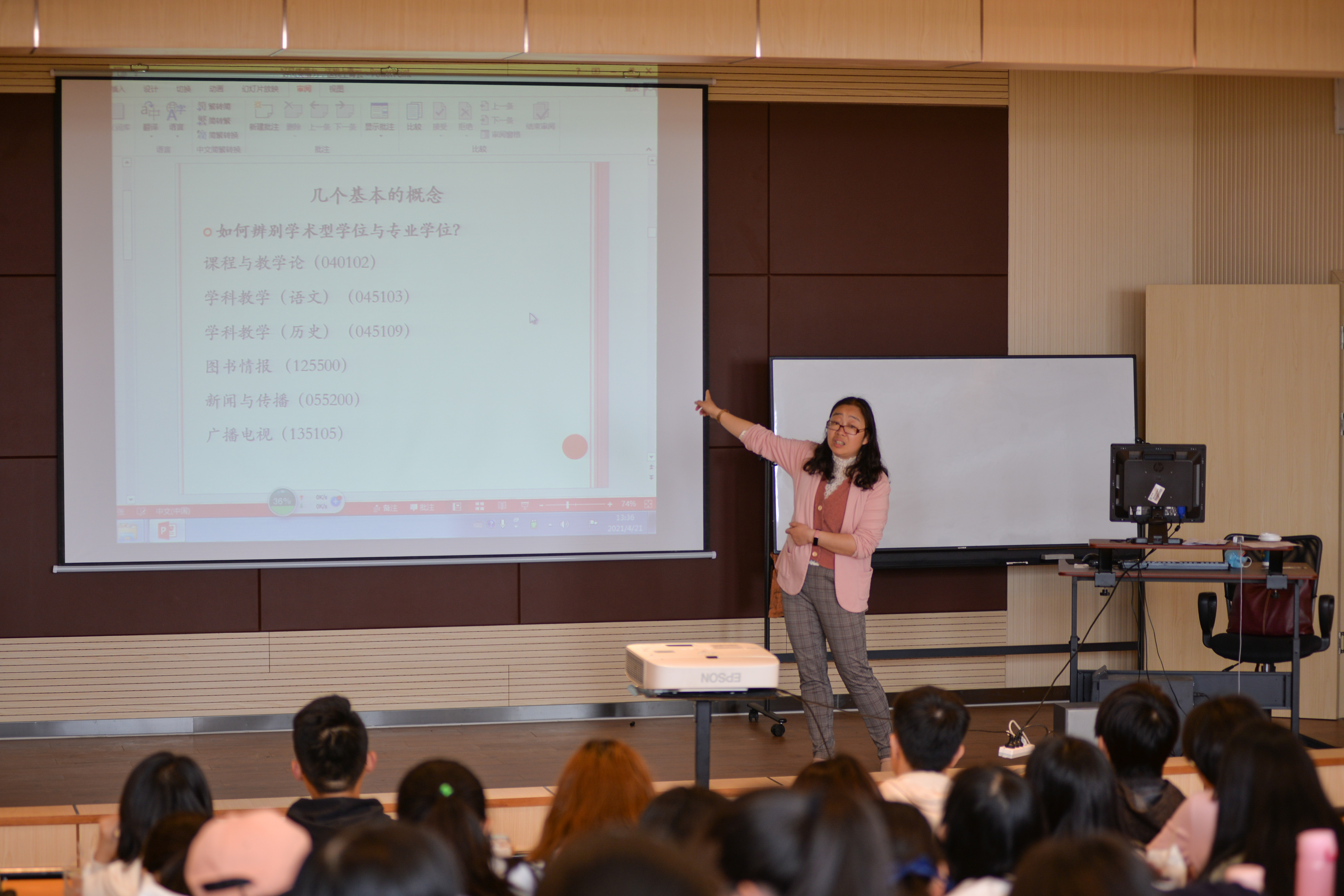 首先,张虹老师阐述了有关考研的几个基本概念,她提出,应在综合考量个人兴趣和未来发展的基础上,确立考研目标;要明确往年所报考专业大致的复试分数线,了解各校自定分数线的专业、报考人数以及实际录取人数等信息。在获取有关信息方面,张虹老师提供了几条途径,包括借助网络媒体,联系招生单位咨询联系人,询问导师及在校研究生等。