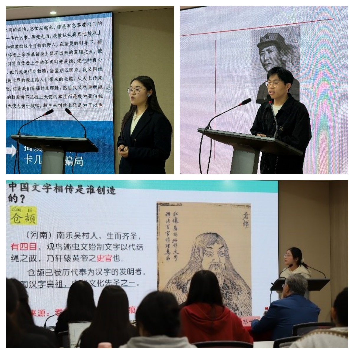 项目组三位大学生讲师作课堂教学演绎。学院2022级中国现当代文学专业研究生邓思雯、2022级中国近现代史专业研究生颜兵以及学院22级汉语言文学(师范)专业本科生邵叶儿分别就《<经典常谈>阅读——走近<说文解字>》《<红星照耀中国>整本书阅读概览》《<鲁滨逊漂流记>阅读——改造“星期五”探微》作课堂教学演绎。演绎之后,两位老师结合自身丰富的教学理论和教学实践经验对三位同学的讲课进行指导。