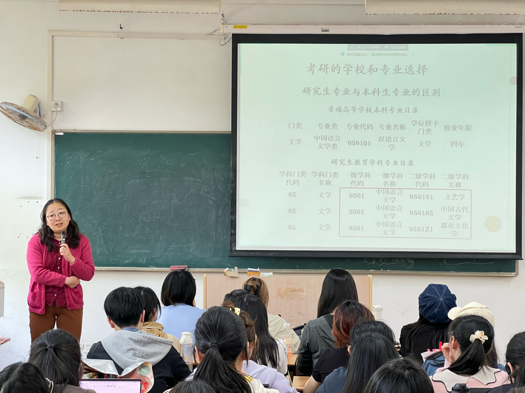 张虹围绕“什么是研究生的专业”“专业信息从何而来”和“研究生招生流程”三个方面,为同学们进行了“备考-考研”一站式流程讲解。张老师阐释了在考研学校和专业选择上的注意事项,并着重讲述了专业学位和学术学位的主要区别,向同学们介绍了考研相关信息获取的途径和渠道。最后,她强调考研不是唯一、必须的选择,希望同学们用正确的心态看待考研的过程和结果。