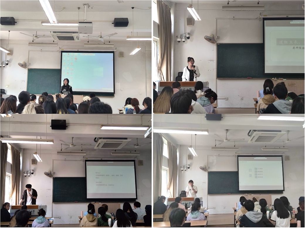 随后,来自2023级学科教学(语文)的彭嫒霖、2023级学科教学(历史)的董珺、2023级图书情报专业的施浩然以及2020级古典文献专业的朱慧宇分别介绍了不同专业考研准备过程中的各类注意事项和宝贵经验。他们希望低年级同学们在复习备考过程中既要保持自律、坚持学习,保证每天学时充足,也要放平心态、提高自信,正确地选择院校和专业,坚定自己的目标,做到劳逸结合。四位同学就现场同学所提出的部分问题进行了解答。