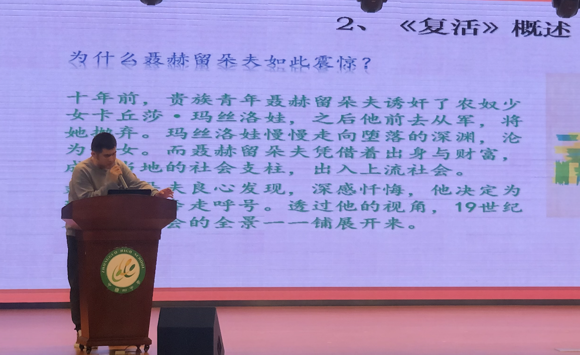 2019级比较文学与世界文学徐立勋同学导读《复活》一书时,首先从列夫·托尔斯泰其人讲起,进而引出《复活》的两大主题,“忏悔的贵族”和“灵魂的救赎”,接着他着重介绍了该书的艺术手法:心灵辩证法的运用。由于中国中学的同学们曾将之改写成剧本搬在舞台上展演,导读现场气氛十分活跃。