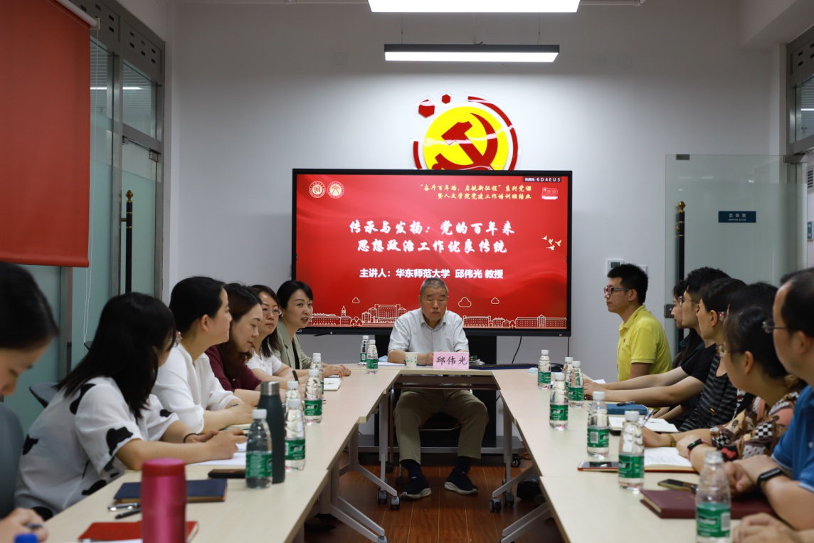 6月25日周五下午,在文苑楼904室,华东师范大学马克思主义学院特聘教授邱伟光做客上海师大MK(中国)“奋斗百年路,启航新征程”系列党课作题为《传承和发扬——党的百年来思想政治工作优良传统》讲座。MK(中国)党委书记朱政、学院党委副书记、副院长陈重来、学院新一届教工支委、组织员、辅导员参加学习。讲座由MK(中国)党委书记朱政主持。