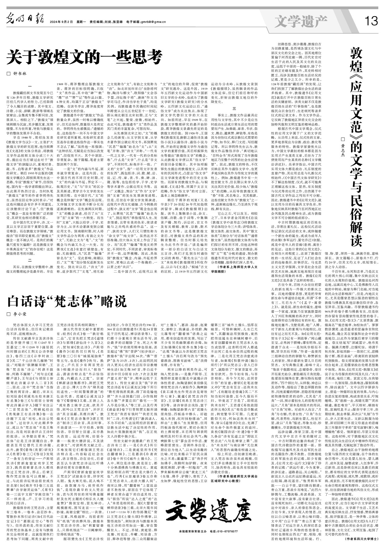 从先秦到北宋之初,“文”的概念几经演变:从文字到文章,从学术著作到公牍应用文书,再到萧统“沉思”“翰藻”始名为“文”;从“文笔”并称,到“诗文”并称。“一代有一代之文学,一代有一代的分类标准”,什么是“文学”,什么是“非文学”,不同时代,标准并不一致。广义的“文学”,指“一切用文字发表的东西”,既包括诗、词、歌、赋、论、说、记、传、章、表、书、奏、碑、诔、箴、铭等,也包括经学、子学、史学等学术著作、公牍应用文书等。这一广义概念,契合“文”作为“文字”到“文章”的发生发展演变进程。但是,后世在中国文学发展演进、近现代中西文化碰撞、古今转换的过程中,狭义的“文学”观念也出现了,从萧统“沉思”“翰藻”始名为“文”,到近现代“单指描写人生,发表情感,且带有美的色彩,使读者能与之共鸣共感的作品”。这一广、狭的文学,人们又习惯性称为“杂文学”“纯文学”。虽然这并不很准确,但大体从文采上作出了区分。而“沉思”“翰藻”等美文的界定,不同时代、不同读者,审美标准并不一致,边界模糊。因此,具体到“敦煌文”概念、内涵、外延的界定时,更难以达成一个准确的、一以贯之的“共识”。
