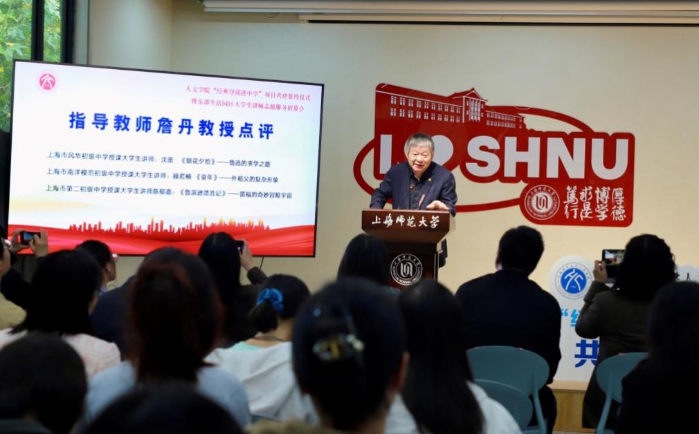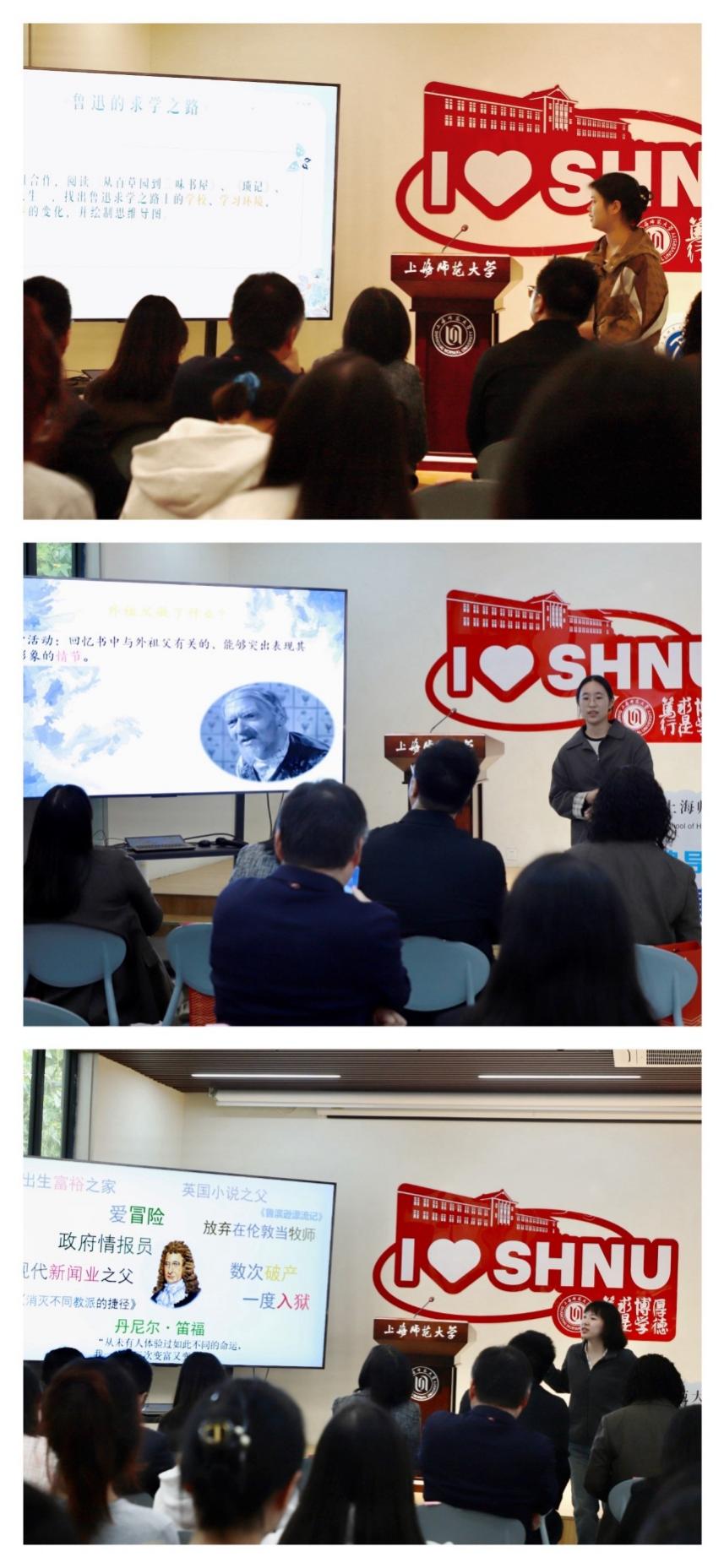 会议下半场聚焦项目指导与交流。上海市风华初级中学授课大学生讲师、2024级学科教学(语文)专业沈蕾、上海市南洋模范初级中学授课大学生讲师、2024级学科教学(语文)专业顾若楠以及上海市第二初级中学授课大学生讲师、2023级古代文学专业陈郁嘉分别对所上篇目《朝花夕拾》《童年》和《鲁滨逊漂流记》进行导读课展示。
