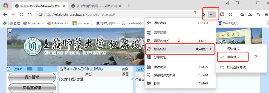 老师个人名下的资产信息(包括设备和家具)都可以在“仪器设备管理平台”里查询及管理。推荐使用360极速浏览器的“兼容模式”来使用该系统,否则有些重要功能将无法使用。(下图为设置兼容模式的方法)