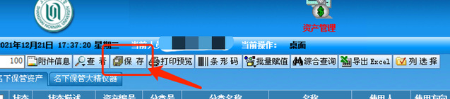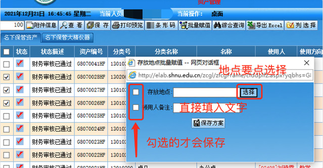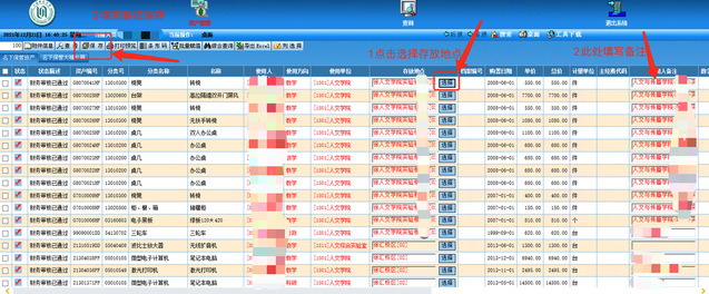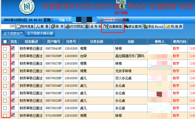 5、如需批量更改信息,比如某某老师名下有10件设备都放在一个办公室,此时可以采用“批量赋值”的功能。请参考下图:先把这10件设备最左侧的方框都勾选,然后点击“批量赋值”。