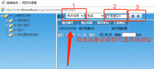 在跳出的“网页对话框”里,先在下拉菜单里选中“地点名称”,再填写您需要变更的地点信息,如文苑楼920,然后点击“查询”,即可得到一条下图箭头所指的地址记录,双击这条记录即可选择该地址为您的“存放地址”。