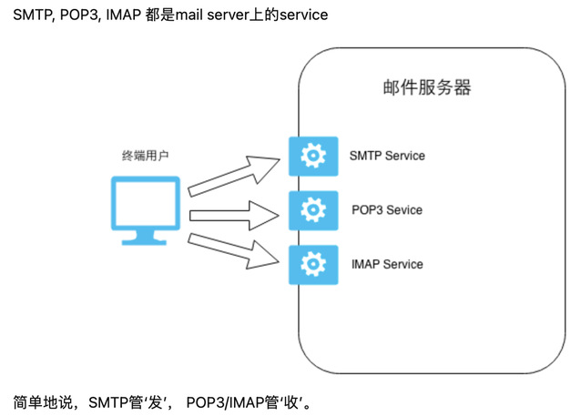邮件服务器的协议一般有SMTP、POP、IMAP三种。SMTP协议负责邮件发送,POP或IMAP负责邮件接收。POP和IMAP最大的区别是:POP协议中客户端的操作不会同步到服务端,比如客户端里已读的邮件在服务端还是未读状态,客户端里删除的邮件在服务端依然存在。但在IMAP协议中,客户端和服务端的操作是同步的——客户端打开过的邮件在服务端显示已读,客户端删除的邮件在服务端也会被删除。