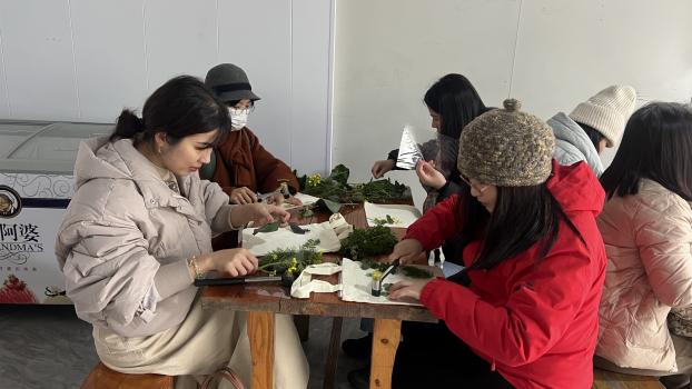 午后微风下,生态草莓园内绿叶层叠,红果垂枝。女教师们手提篮筐,躬身穿行于田垄之间。她们指尖轻捻,颗颗饱满的草莓落入篮中,在劳动中收获甜蜜和喜悦。在不远处的创意工坊内,叮咚敲拓声宛如春日的韵律诗。教师们将采集的油菜花、蕨叶等平铺于帆布袋上,以木槌轻击,叶脉汁液渐渗布面。布面上,每一道纹理都是自然的馈赠,绘就独一无二的“春日水彩画”。