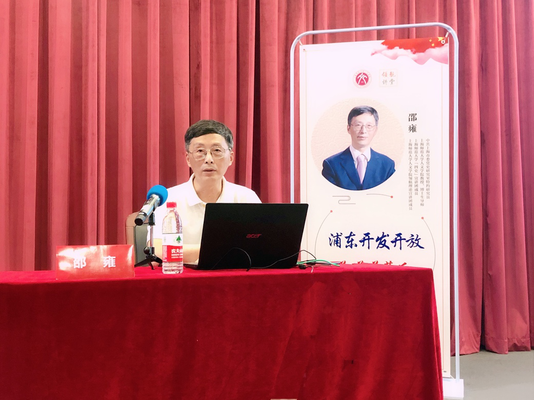6月10日下午2点,人文学院领航讲堂首场讲座于文苑楼二楼人文礼堂举行。历史系教授、博士生导师邵雍做客领航讲堂作“四史”教育之《浦东开发开放的台前幕后》讲座。学院教师在会场中认真聆听,教工第四党支部结对支部——研究生院(部)党支部党员教师以及学院各教师党支部结对的2019级学生支部党员线上收听收看直播。讲座由学院副院长、教工第四党支部书记姚潇鸫教授主持。