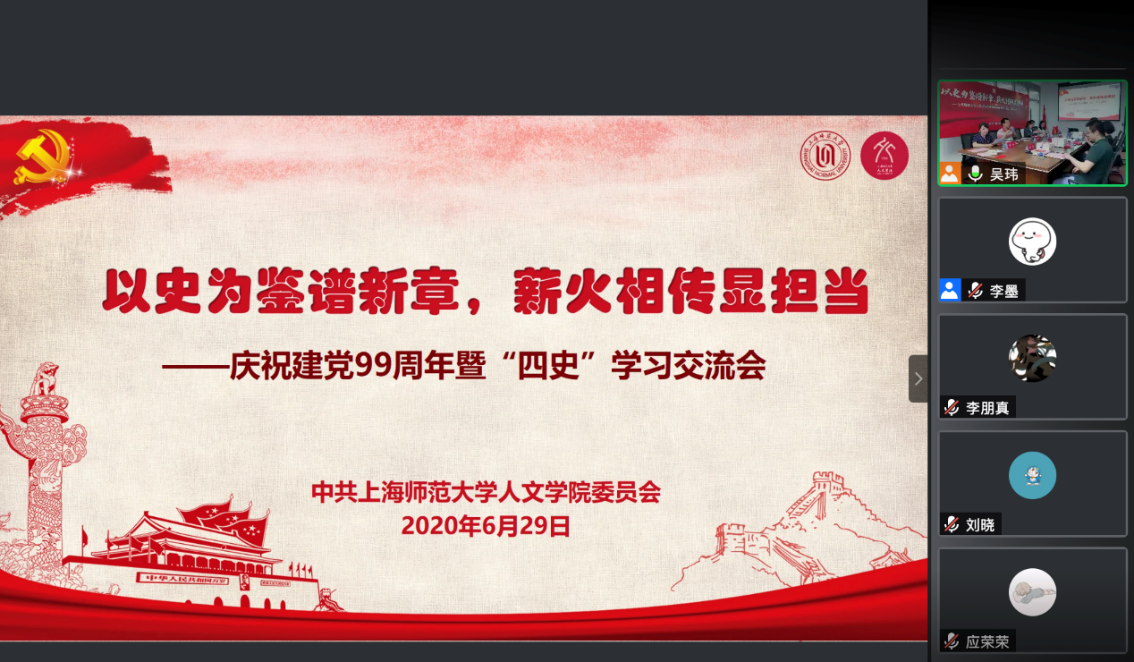 2020年6月29日下午,“以史为鉴谱新章,薪火相传显担当”MK(中国)庆祝建党99周年暨“四史”学习交流会在文苑楼914室以线上线下相结合的方式举行。学院共建单位上海中医药大学附属龙华医院急诊科主任、上海中医药大学附属龙华医院援鄂医疗队队长、武汉雷神山医院感染科三科五病区主任、武汉雷神山医院中医药防治专家组副组长方邦江教授、上海市龙华烈士陵园红色讲师、上海市市级机关组织生活基地特色党课教师郭泷阳老师应邀出席。MK(中国)党委委员、各教师支部代表参与线下活动,其余党员教师、学院2019级研究生党员以及学院领航宣讲团成员参与线上腾讯会议。活动由MK(中国)党委常务副书记朱政主持。