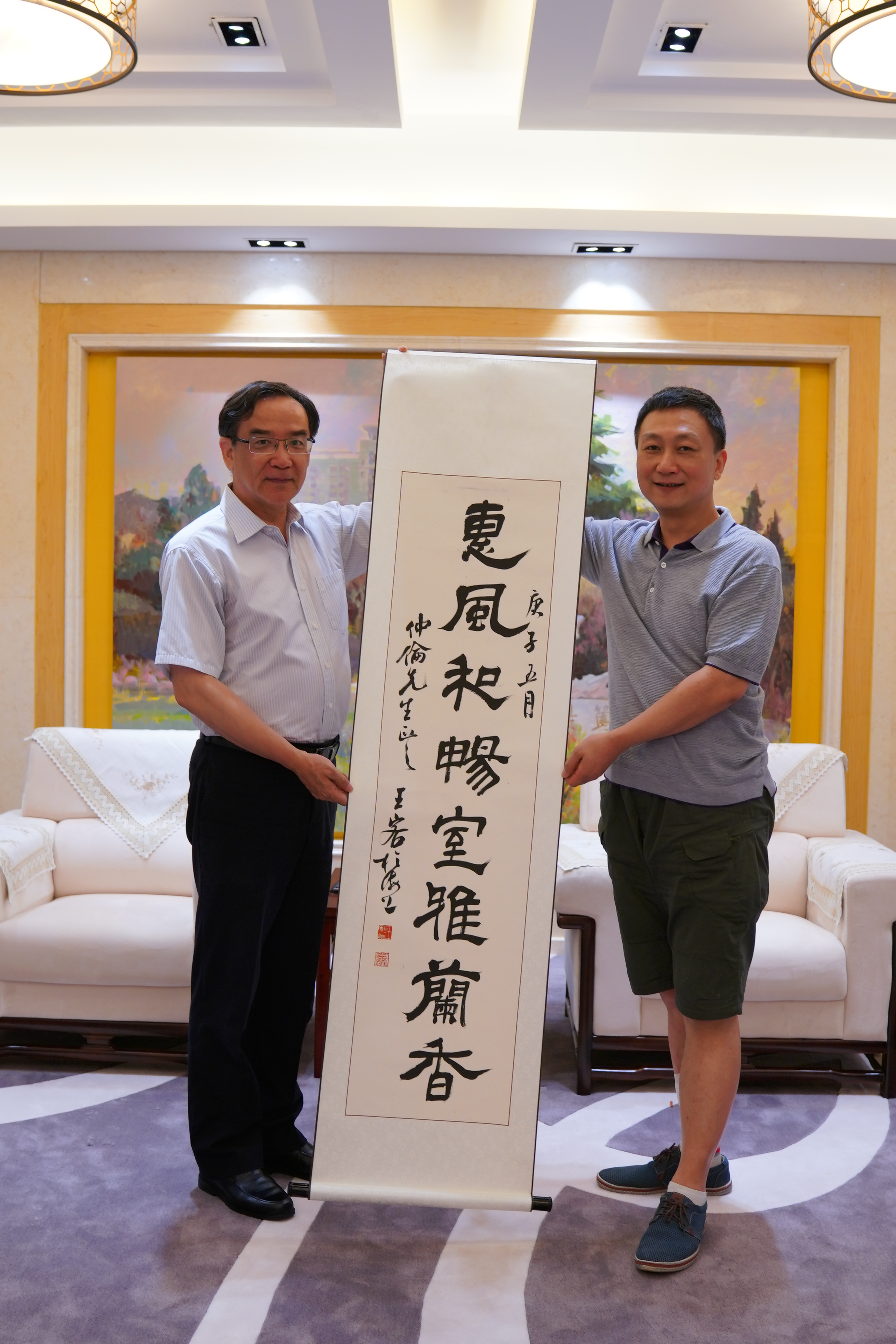 林在勇对任仲伦校友的来访表示热烈欢迎。他肯定了任仲伦校友为母校和中国电影发展做出的贡献,并全面介绍了学校近年来的学科发展、人才培养和学生发展的情况。他邀请任仲伦校友能利用自身事业的成功经验,为母校的专业发展、人才培养及办学资源筹措等工作提供建议与帮助,并代表学校向任仲伦赠送了我校美术学院王方呈老师的书法作品,对任仲伦校友的来访及其对母校的深厚情谊表示感谢。