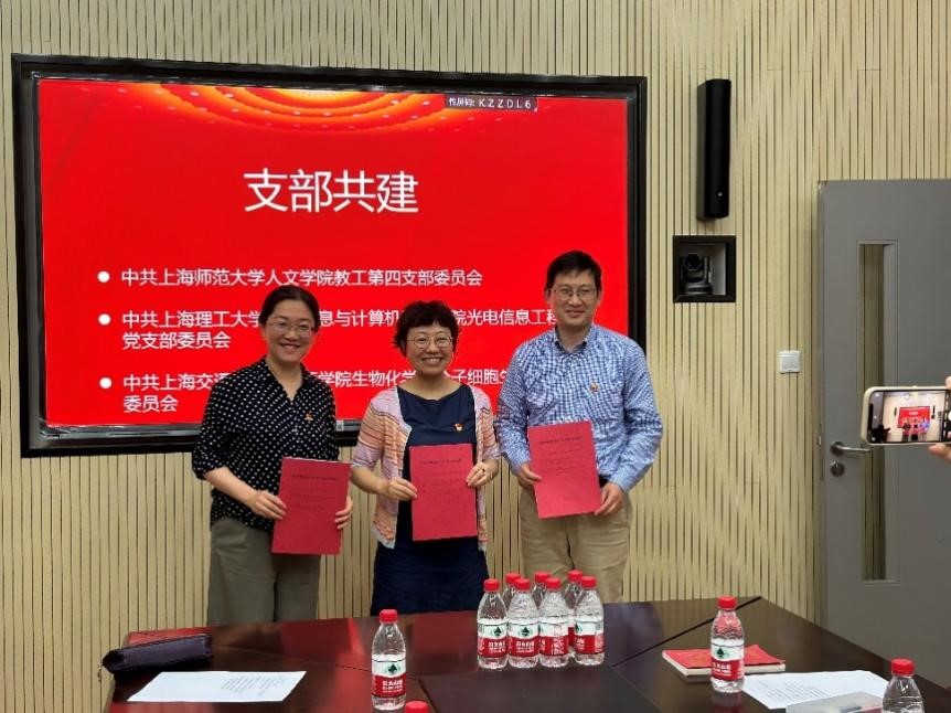 会议伊始,上海交通大学基础医学院党委书记陈亮致辞。上海交通大学基础医学院生化细胞系支部书记杨洁、上海理工大学光电信息与计算机工程学院光电信息工程教工党支部书记冯吉军、MK官方网页版MK(中国)教工第四党支部书记姚霏分别介绍各自支部情况、特色和近几年取得的党建成果。随后,三个支部开展共建签约仪式,就未来基层党建、支部联谊活动等合作事宜展开交流。