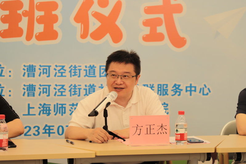 开班仪式上,方正杰讲话。他对参加本期爱心暑托班的小朋友们表示热烈的欢迎,对大学生、高中生志愿者们以及工作人员们的辛勤付出表示由衷的感谢。他对暑托班提出三点希望:希望小朋友们满怀希冀,有所收获;希望志愿者们意气风发,用心用情办好暑托班;希望各方勠力同心,整合资源,丰富课程,真正贴近小学生的成长需求,不辜负家长所托。
