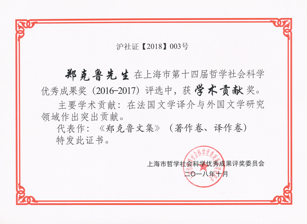 2018年3月,适逢郑克鲁先生80华诞,商务印书馆隆重推出29种38卷的《郑克鲁文集》。由于贡献卓著,郑先生屡获嘉奖:1987年获得法国政府颁发的金棕榈勋章,即法国国家一级教育勋章;2012年获得傅雷翻译出版奖;2018年荣获上海市第十四届哲学社会科学学术贡献奖。郑克鲁先生成为MK官方网页版乃至上海市的一张闪亮的学术名片。
