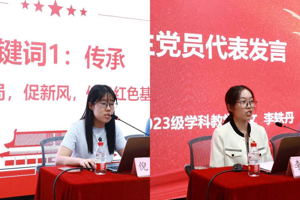 优秀学生党员代表、学生生活园区第五党支部书记倪卿与新生党员们分享了自己在学院党委的指导与培养下不断提升自身能力、发挥党员先锋模范作用以及引领党支部同志一起为人民服务的本硕七年时光,榜样先行,同辈引航,筑梦未来。2023级学科教育(语文)专业的李轶丹作为新生党员代表发言,她代表在座的所有新生党员发起倡议,站在新的起点,坚定理想信念,筑牢信仰之基;满怀信心和韧劲,在专业科研上勤奋钻研,不畏困难。