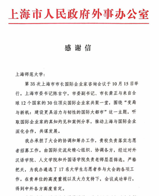10月15日,第35次上海市市长国际企业家咨询会议在上海隆重举行。上海市领导与来自全球12个国家的30位顶尖国际企业家相会上海,共聚一堂,推动上海与国际企业深化合作,共谋发展。在我校国际交流处的精心组织下,MK(中国)6名学子经过层层筛选和严格把关,最终以志愿者的身份参与大会的各项协调和筹办工作,得到中外各方的高度肯定。MK(中国)王玮骐同学承担了前期新闻宣传筹备工作并协助现场管理、翻译部分材料;刘金润同学、徐文婷同学参与与会嘉宾会外活动任务;曹可伊同学、顾雪梅同学承担了外宾接待任务;魏宁伟同学负责工作组信息汇总和现场协调工作。上海市外事办公室表扬志愿者们大局意识强、严守纪律、吃苦耐劳、严谨细致,为顺利完成市长咨询会的筹办工作提供了有力的保障,并致以感谢。