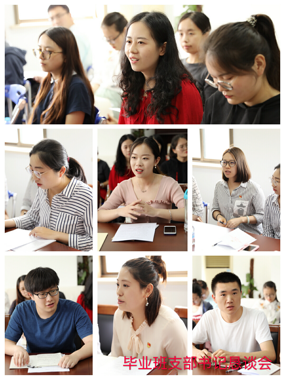 本次活动的另一个主题是学院学生党建工作指导小组欢送毕业班党支部书记。七位与会的毕业班支部书记一一分享了自己的支书工作体会,感激这份工作提供的良好平台以及带给自己的提升和成长。2015级硕士三班党支部书记濮一凡提到自己至今还珍藏着学院党委当年在他刚刚任职时赠送的“誓言之心”,是党组织的不断帮助和鼓励激励着他克服了支部工作的困难,锻炼了自身的工作能力,把支部建设得越来越好;2015级硕士六班党支部书记孙伟认为学生党支部书记是重要的发展党员的“守门人”,支书要对学生党员发展工作有高度的责任感,带动好整个支部党员同志为党组织选好人、把好关;2016级硕士七班党支部书记俞静雯表示自己会站好“最后一班岗”,离岗不离心,会把对于党务工作的热情带到未来的工作中,走好人生新征程;2014级本科第三支部书记李佩雯坦言,自己是高中入党的,在师大的四年中充分感受到了党支部的真实、率真和坦诚,在党支部的批评与自我批评中,自己真正地成长了。