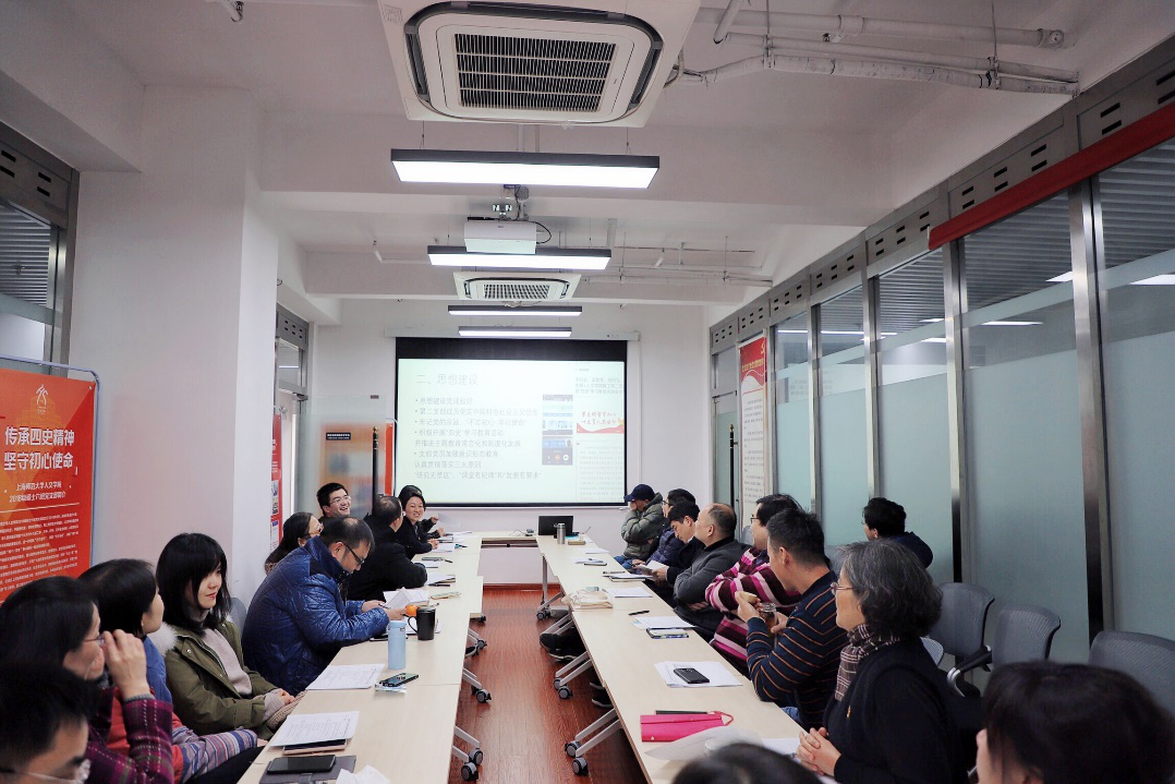 会上,各教工党支部书记对照《2020年人文教工党支部规范化建设评价指标》,分别从支部贯彻执行党的决策部署、“四史”教育专题学习、组织生活制度落实、主题党日活动开展、发挥党员先锋模范作用等方面全面总结教工党支部一年来的工作情况,认真分析当前支部建设存在的问题,并提出下一步的工作思路和改进举措。教工第一支部书记王双成依托“学习强国”学习平台推进支部理论学习工作,介绍了如何在支部工作中开展好教师支部和学生支部结对工作,为大学生思政工作贡献力量;教工第二支部书记张会超积极组织开展“四史”学习教育活动,在认真落实“三会一课”和民主评议党员制度中加强纪律建设;教工第三支部书记刘畅介绍了在疫情期间支部党员如何充分利用网络平台,发挥专业特长,以实际行动“抗疫”;教工第四支部书记姚潇鸫围绕支部日常工作、课程思政建设、红色资源挖掘和服务功能拓展四方面进行汇报;教工第五支部书记张虹介绍了党支部在主题党课活动、党建结对共建等方面的情况。