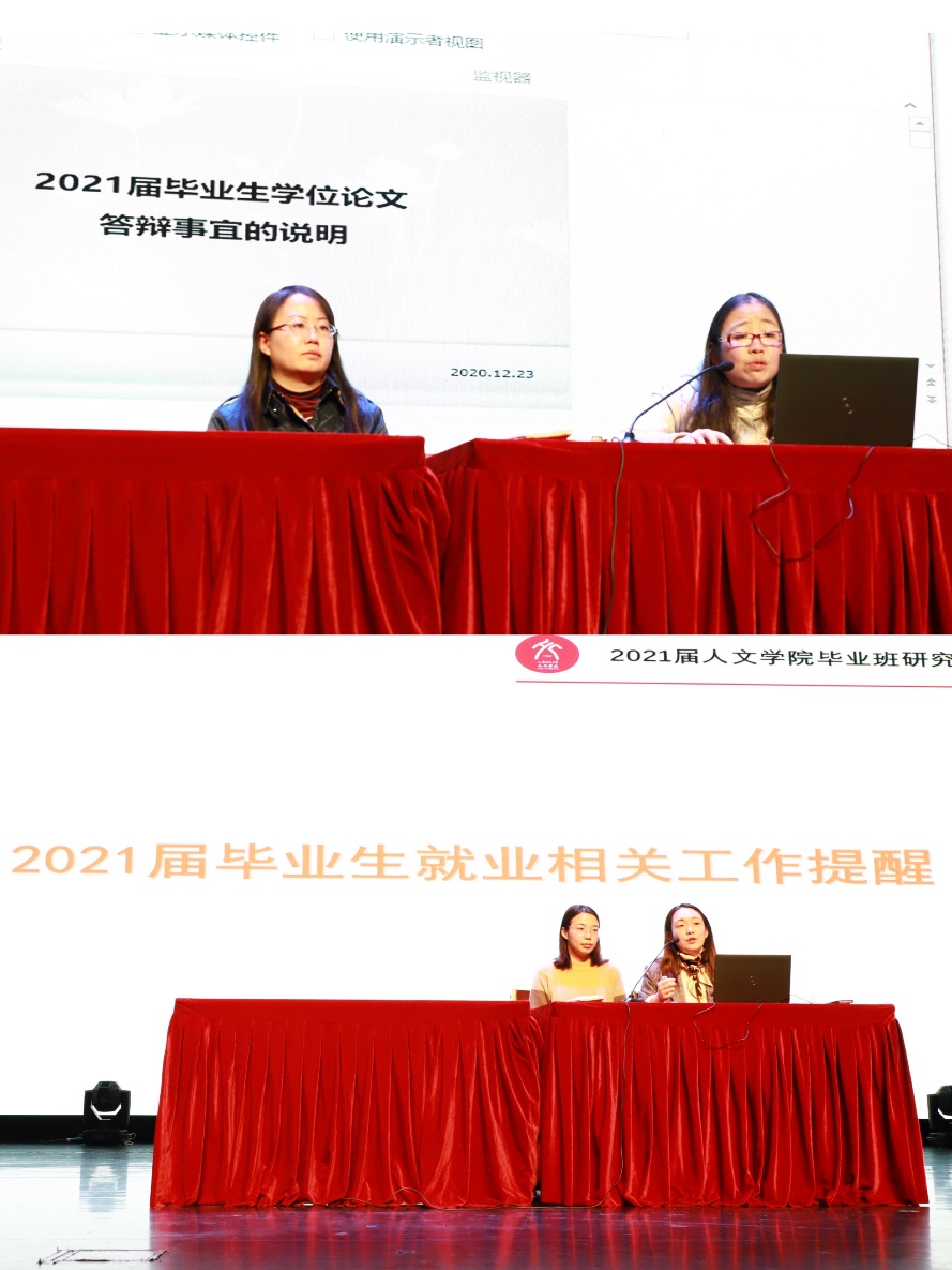 张虹老师就毕业论文撰写、答辩以及学位授予等事宜作详细介绍,向与会同学们明确了毕业答辩的时间轴、进度表以及注意事项;研究生辅导员吴玮就四联单的填写、就业信息获取等事项作介绍,她提醒同学们在后疫情时代,要转变就业观念,抓住一切招聘机会,利用好有效的就业信息平台。