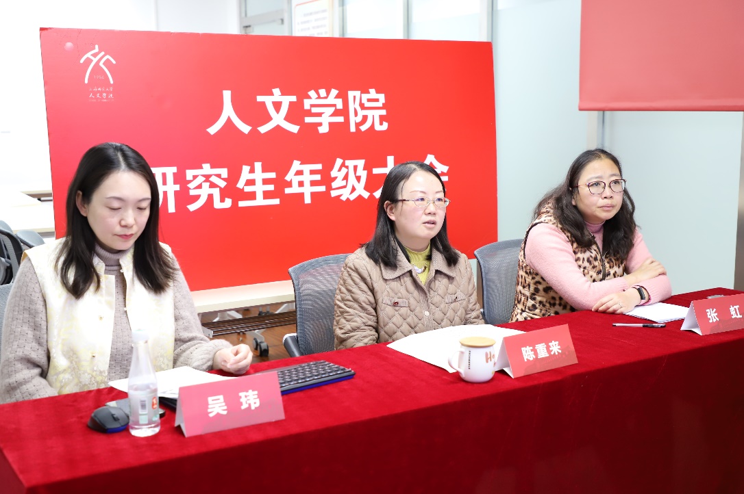随后,张虹老师为毕业生们介绍了学业论文盲审与答辩的相关事宜,明确了论文查重与送审的时间节点,敦促大家以严谨、认真的态度对待论文写作,确保各项审核环节顺利通过,交上圆满的毕业答卷。