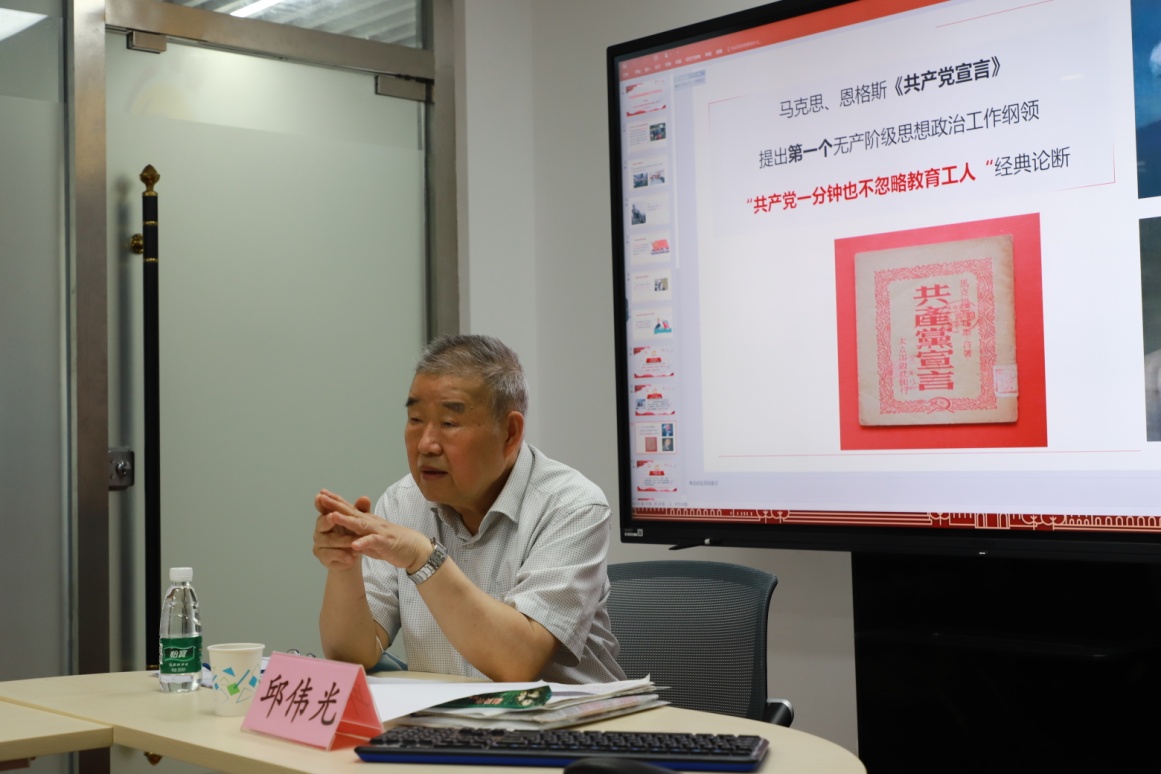 邱教授指出,百年思想政治工作史是党史的重要组成部分,通过学史明理,深刻领悟坚持党的领导的历史必然性,是党兴国强的根本所在,是人民幸福的命脉所在。建党百年来党的思想政治工作告诉我们,要始终坚持马克思主义指导地位,广泛弘扬社会主义核心价值观,加强对中华优秀传统文化的挖掘与阐发;要不断提升社会主义意识形态的核心要义和吸引力,把握规律、区分对象、精确思政;要培育时代新人,建立知识型、能力型、创新型劳动大军。