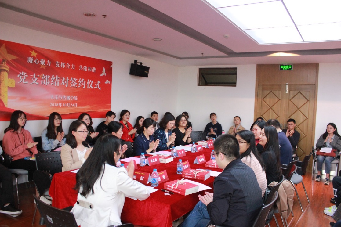 10月24日周三下午三点,人文与传播学院党支部结对签约仪式暨全国教育大会精神学习讨论会在文苑楼602室举行。学院党委委员、教工党支部书记、研究生辅导员以及2018级硕士党支部支委参加活动。活动由学院党委副书记杨康贤主持。