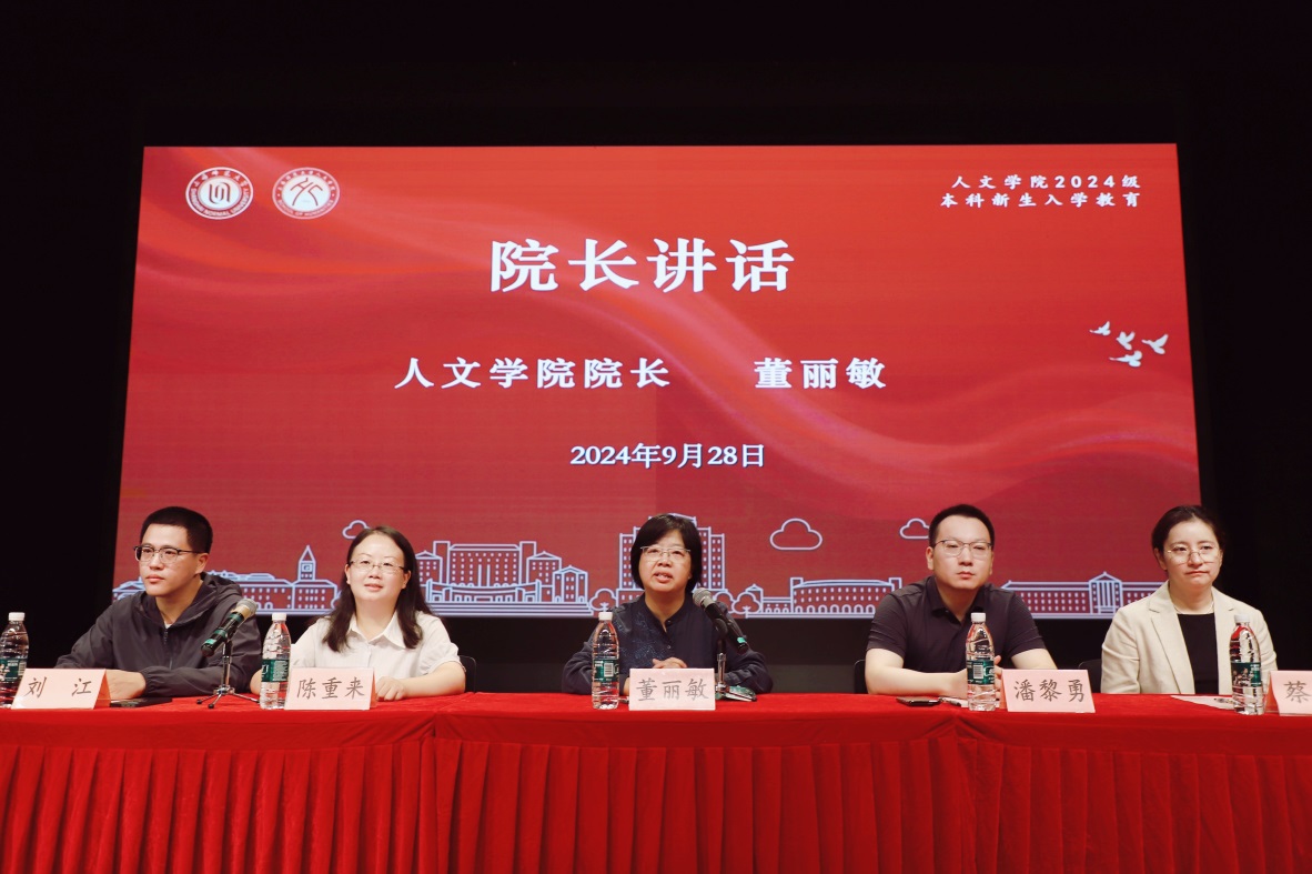 院长董丽敏讲话。她对新生们的到来表示热烈的欢迎和衷心的祝贺。她鼓励同学们在这个全新的时代变局下,面对不确定性,能够努力寻找自我、成为自己并超越自己;能够理解常识,也能够建构常识;既能风声雨声读书声,也能关心家事国事天下事,最终成为有理想、敢担当、能吃苦、肯奋斗的新时代青年。副院长蔡萌作本科教学评估动员。她介绍了学院本科教育教学情况,为新生们描绘了一幅充满机遇与挑战的学术蓝图,引领新生踏上一段既充满无限可能又需要勇于探索的学术旅程。她希望同学们能够合理规划时间,在确立目标后要始终保持刻苦的态度。历史学系副主任刘江作为教师代表发言。他结合自己的学术经历和专业背景,围绕认识自己与认识世界两个主题,向新生们传授了学习之道与人生智慧,并鼓励大家对于新知识新技术要保持好奇和敏感,勇于交流、善于创新。