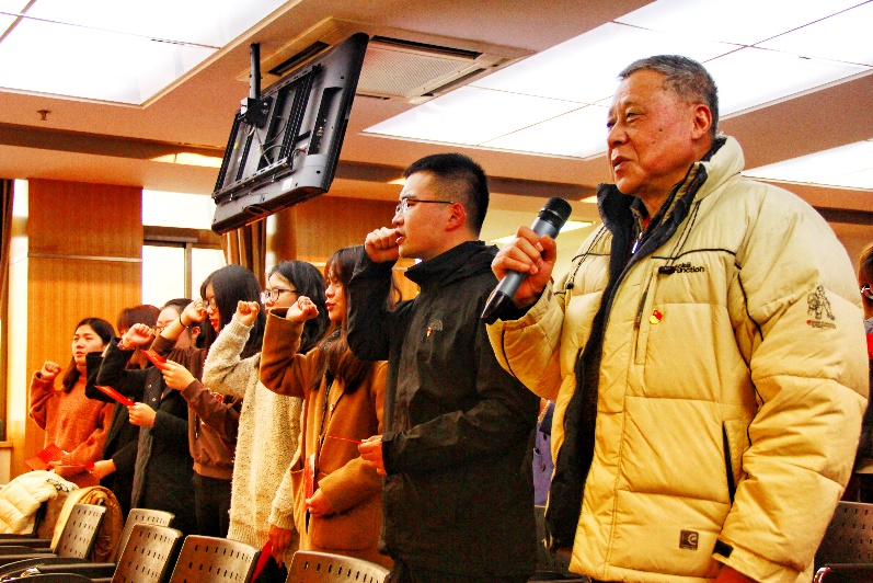 参与本次活动的还有2018年下半年的预备党员们,他们面向党旗,在丁光勋老师的带领下,顺利完成了神圣而庄严的入党宣誓。
