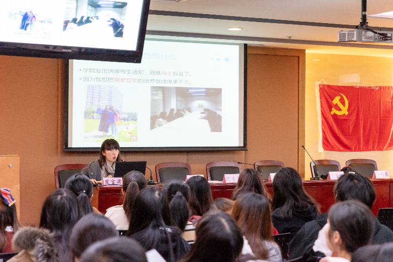 活跃在互助和奉献中的不只有本科生,研究生们也在实践中致力于言传身教、薪火相传。2017级学科教学(语文)董丹和2017级都市文化学白雪作为2017级研究生导生代表做了交流。董丹同学认为导生工作贵在起点,重在过程,没有终点,导生应将共识化作行动,将承诺变为现实,踏踏实实做好“服务”二字。白雪同学展示了学院导生团新媒体工作组的系列成果,注重线上线下互动交流,温暖人文学子,播撒人文情怀。