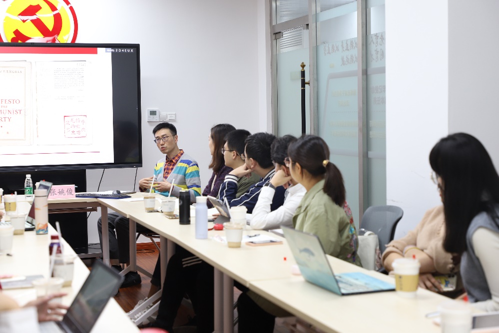 张老师用首版中译本《共产党宣言》的小插曲调动了现场气氛。由于当时排版疏忽,书名被印成了《共党产宣言》,成了这一译本独一无二的印记,直到9月份印第二版的时候,才修改为《共产党宣言》。张老师指出,前后两版《共产党宣言》在当时的革命青年和知识分子中产生强烈反响,这部科学社会主义标志性著作在中国的传播,对中国共产党的诞生有重要意义。革命的道路从始至终都是曲折的,革命志士在不断纠错中奋勇向前。张老师在此基础上对寓意着坚持真理、坚守理想,践行初心、担当使命,不怕牺牲、英勇斗争,对党忠诚、不负人民的伟大建党精神进行了进一步阐释。