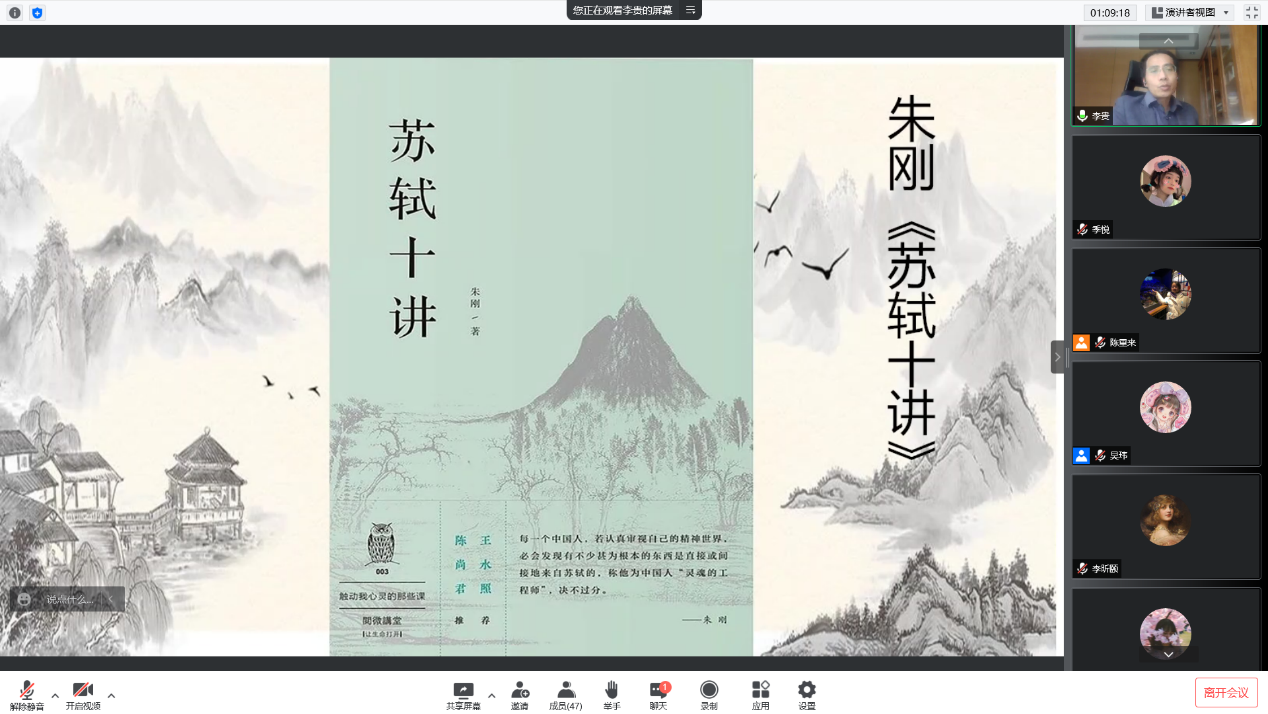 李教授结合疫情封控期间出现的疫情文学仿写运动,从文学角度和个人防疫经历引入,与同学们漫谈疫情期间的读书生活。李教授从当前在校大学生们的日常生活供应与防护安全有充足保障谈起,努力减轻同学们因疫情产生的焦虑情绪,引导学生以科学的态度认识当前疫情形势。李教授提醒处于疫情封控期间的同学们应适度使用社交媒体,积极做好心理调适,减少负面情绪,避免浪费时间精力成本,降低学习工作效率。他引入“信息茧房”等概念,进一步指出冲破“信息茧房”的“精囊妙计”:兼听则明、抬头望天、脚踏实地、读书思考。李教授通过苏轼的《李氏山房藏书记》向同学们点明自古以来读书的重要性与珍贵性,并推荐了《庄子讲义》《苏轼十讲》等经典书目供同学们选读。他希望同学们在读书中能做到溯源与目验、专精与博览,学会怀疑、提问,能独立思考,真正在阅读中实现“循序渐进、熟读精思、虚心涵泳、切己体察”。