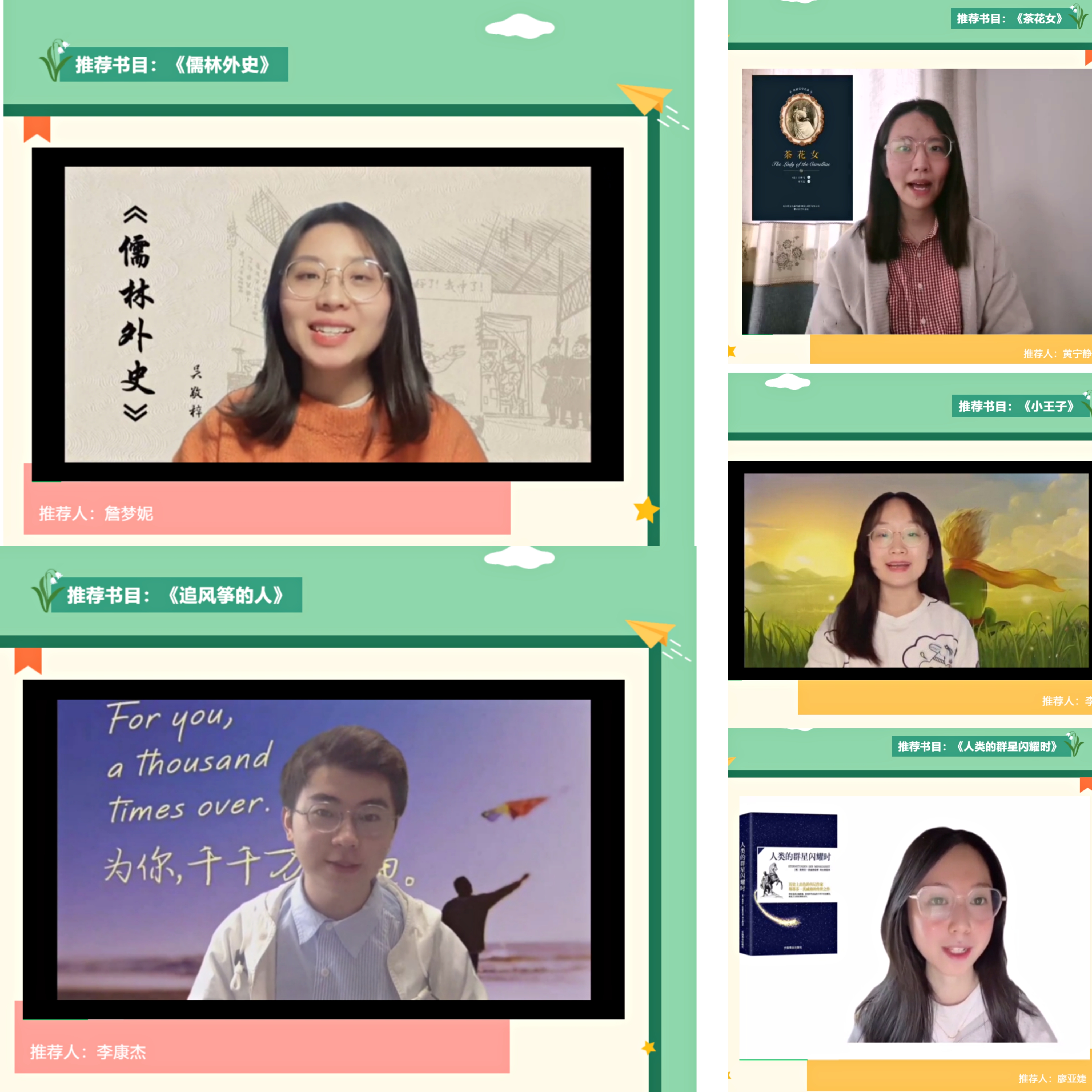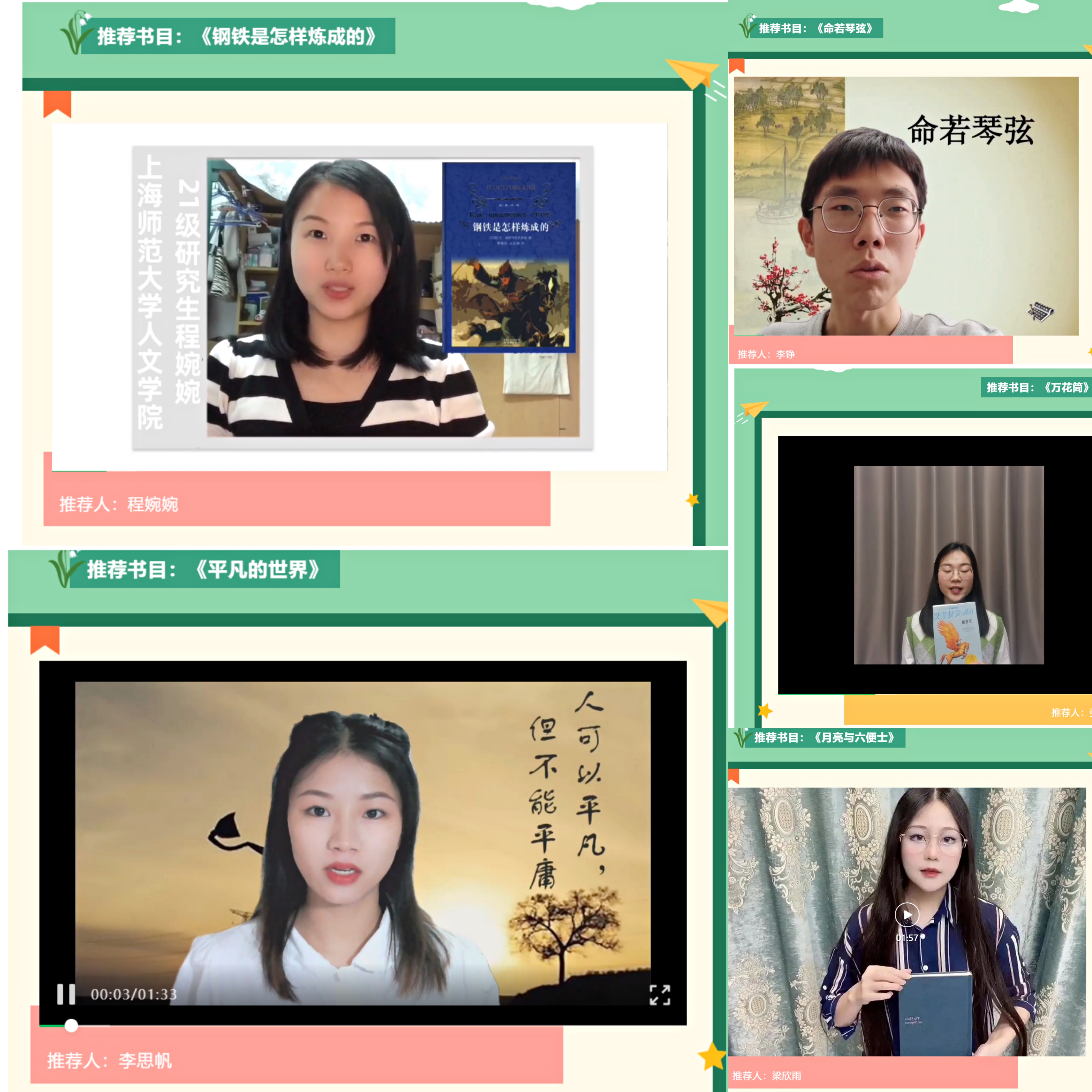 书籍是人类记忆的容器,是人类智慧的结晶,也是人类进步的阶梯。应上海市第四中学诚邀,MK(中国)课后服务项目组成员学科语文黄宁静、文艺学李康杰、中国现当代文学廖亚婕等10名研究生紧急录制好书介绍微课,在线向中学生们推荐正能量的经典名著。在筹备微课阶段,大部分小讲师们都身处师大校园,足不出寝,录课条件较为有限,但同学们不惧困难,精心准备详实的介绍内容,认真打磨每一个录课细节,并主动关照中学生“宅”家学习的学段与学情,切实从中学生的阅读兴趣出发,结合当前抗疫主题,言简意赅地揭示好书主旨,用阅读启迪智慧,促进成长。
