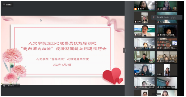 4月24日晚19时,MK(中国)两校区心理委员沟通技巧培训会在腾讯会议室举行。MK(中国)学工团队、实习辅导员以及50余名学院本研学生心理委员出席会议。会议由MK(中国)辅导员曹小艺主持。