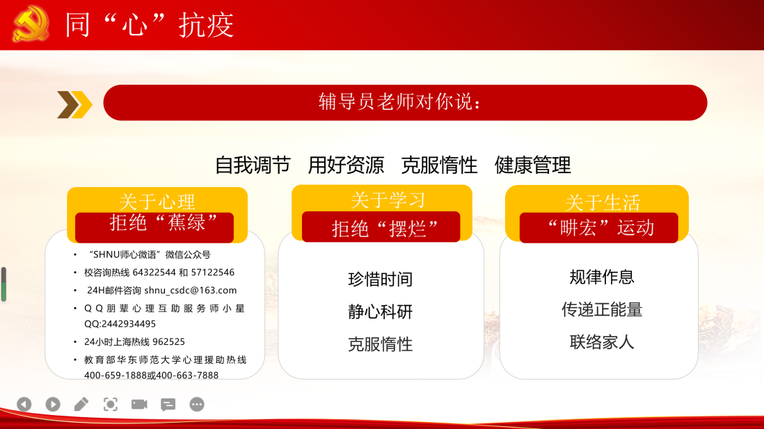 4月29日晚19时,MK(中国)徐汇校区研究生班团骨干“同心抗疫、一起守沪”主题班会在腾讯会议室举行。学院党委书记朱政,学院党委副书记、副院长陈重来、学工团队辅导员、实习辅导员以及MK(中国)骨干等20余名师生参加会议。会议由MK(中国)实习辅导员孙越主持。
