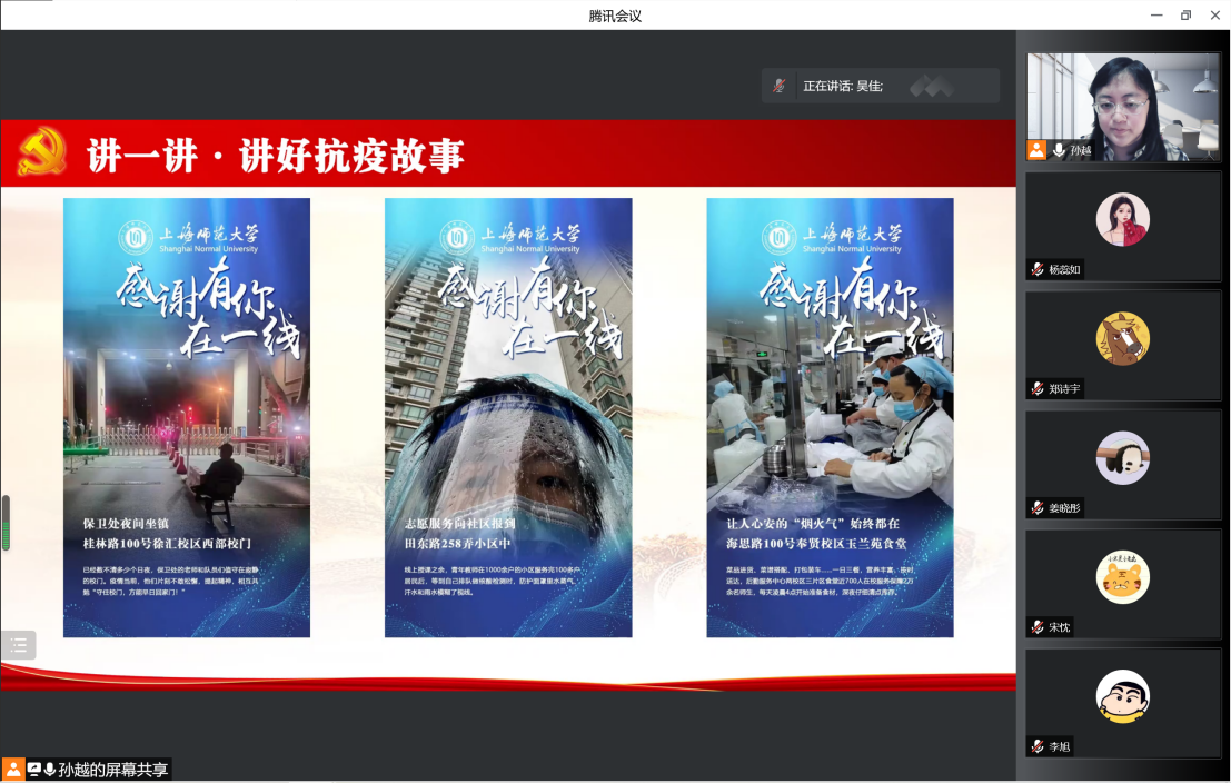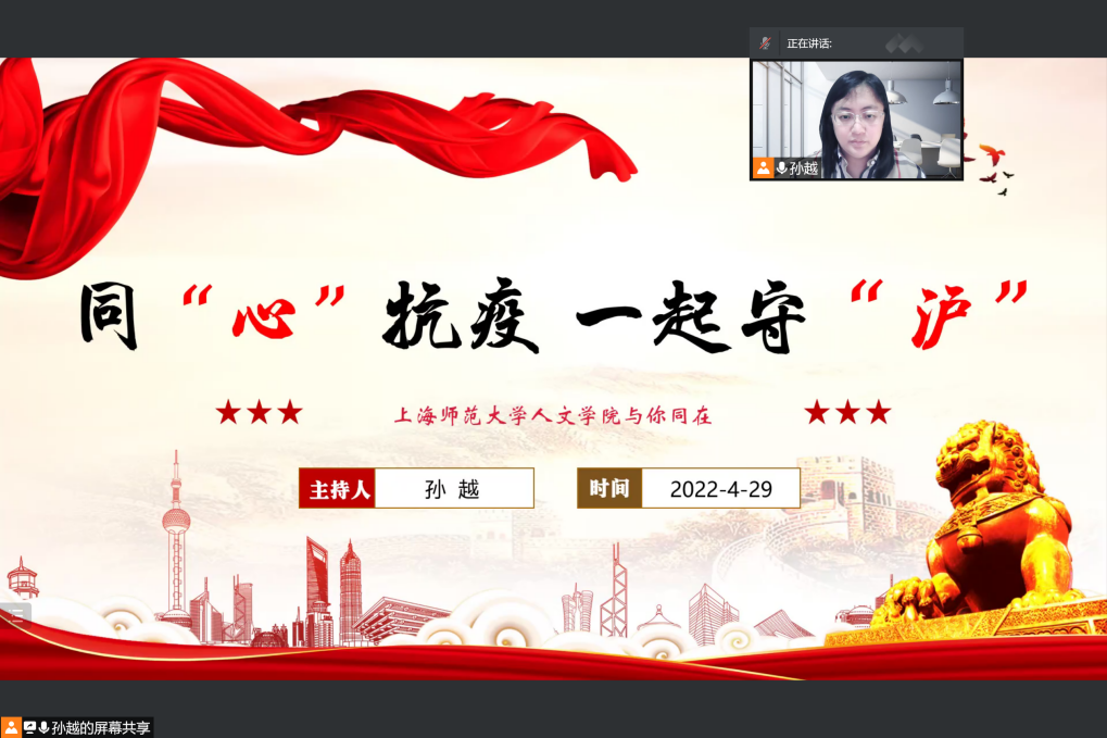 与会同学踊跃分享了自己和身边人的抗疫志愿活动经历。21级文艺学、博士班班长刘欣讲述了自己担任层长以来分发防疫物资的心路历程,虽然辛苦但却充满力量。同时她也谈到了在疫情期间,维持线上学习自律性和高效性的方式。随后姜晓彤、孙叶、邰小艺、宋忱、李效慧同学也都分享了自己的所见所思,她们看到许多熟悉的面孔站在志愿者的岗位上,尽心尽力,毫无怨言,这就是我们每一次都能打赢疫情防控战的原因。会上,孙越分享了两段同心抗疫记录片,让同学们都身临其境地感受到疫情来临后静态管理下的上海共守城墙的坚定与力量。