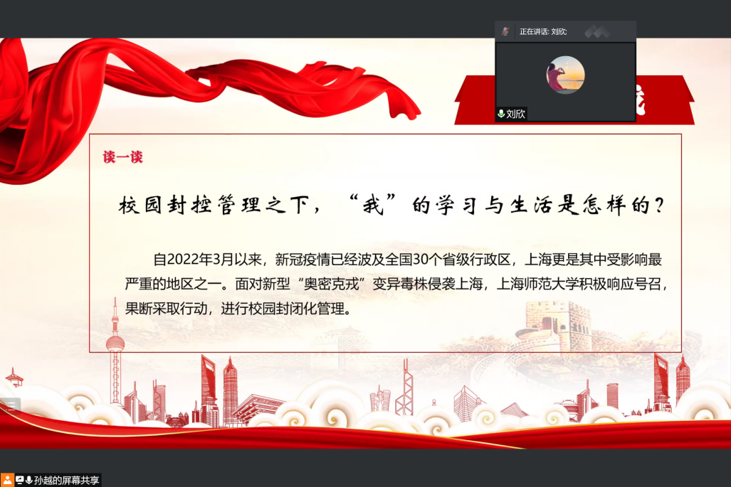 灾难面前没有人能置身事外,从来不存在一个人的桃花源。20级课程与教学论、学院研究生团总支书记杨蕊如,虽未在上海,却心系校园,她讲述了自己的家乡吉林省已迈过步步艰险、终迎曙光的历程,期盼着上海也能早日胜利,共赴春光。之后吴佳、雍佳丽同学也从新媒体工作和校外的视角分别谈及了自己的故事和感悟。