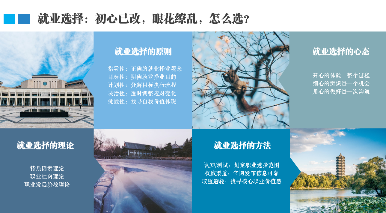 通过此次班会,进一步帮助同学们树立正确的择业就业观念,学会调节就业择业过程中心理波动,运用合理的方式方法进行未来职业选择,使学生在低年级就能“以终为始”,自觉提升就业能力和生涯管理能力,积极做好面向未来的职业准备。