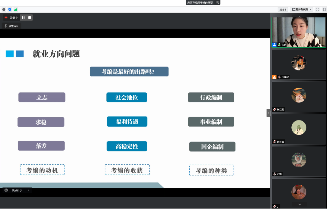 李妍老师对高校毕业生就业基本概况和往年师大就业数据进行分析,并根据提前下发的调研问卷反馈解答了同学们关心的面试、就业方向等方面的诸多疑惑。