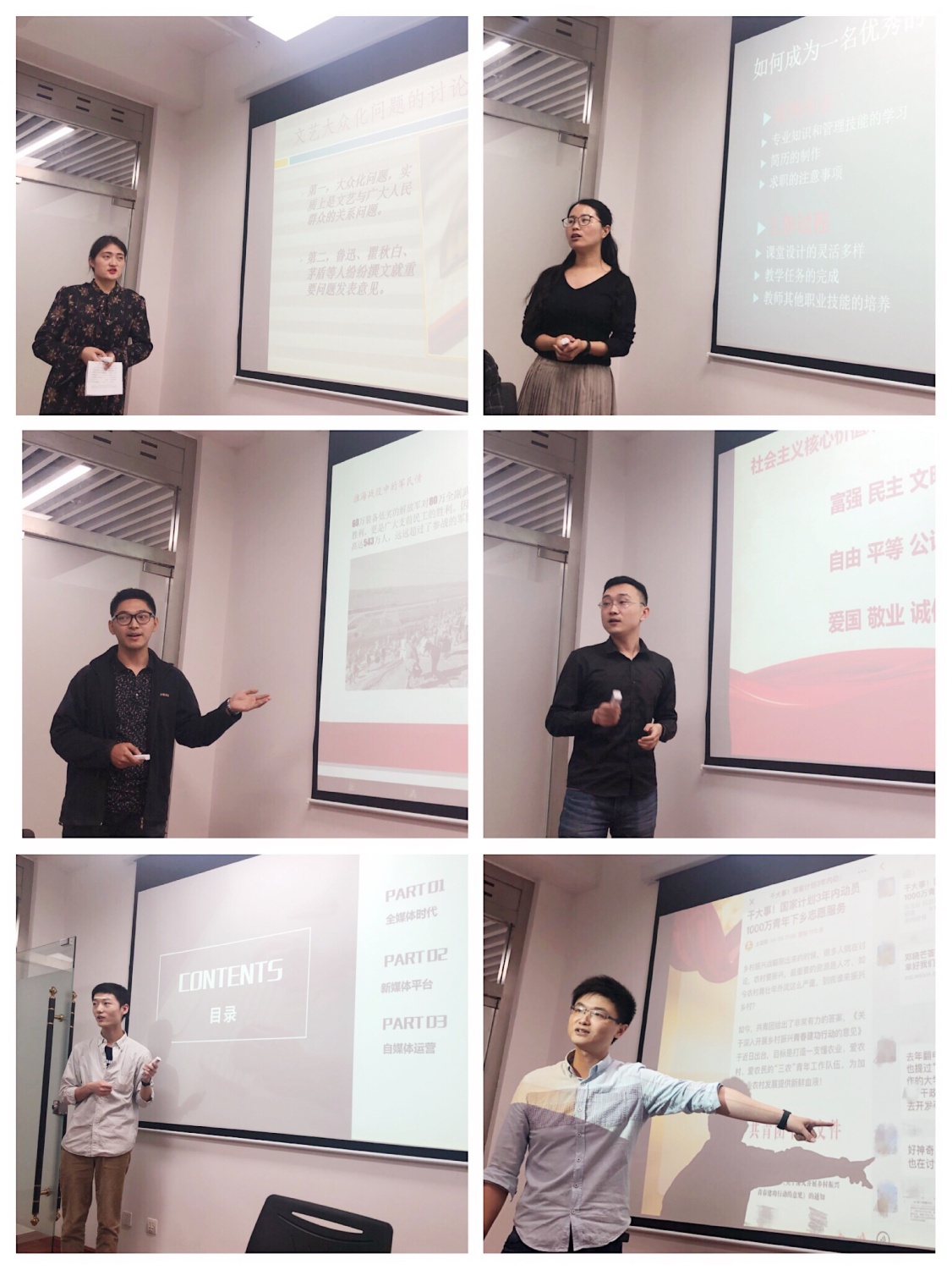 参与试讲的同学结合各自专业特色与个人特长,自选题目,精心准备,重点围绕新党章学习、解放战争、红色文学、支教经历、教育教学、新媒体制作与营销等方面,对试讲主题和基本教学内容作了积极陈述。试讲小组评委根据同学们的试讲内容进行提问,并对试讲学生的现场表现给予指导与建议。试讲选拔会后,评委们对选拔结果作了进一步讨论。19名同学成为了宣讲团首批成员。
