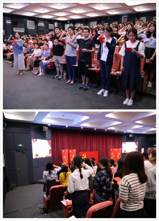 在庄严的会场中,姚霏带领学院2019年新发展的预备党员进行入党宣誓。铮铮誓言响彻耳边,热血激情澎湃心间,预备党员们难掩激动的心情。2017级现当代文学刘灵表示,宣誓的那一刻,报出的是宣誓人不同的名字,看到的是一样年轻坚毅的面庞,感受到的是同样忠贞的誓言——“在勇敢前行的路上,时刻努力怀揣着有温度的初心,才能让我们的青春在奉献中闪光。”2017级中国古典文献学毛蔚琳说到,今后将始终把入党誓词放在心间,充分发挥学生党员先锋模范作用,为党和人民贡献力量。2018级学科历史岳增帅谈到,作为中国共产党党组织中年轻的一员,在发出誓言的那一刻,自己早已决定为实现共产主义事业奋斗终身。2016级汉语言文学师范世承班尹伊人表示,自己将会把铿锵有力的誓言,化为激励与鞭策,从一点一滴做起,以一言一行证明。2016级广告学2班钱晓悦说到,宣誓的那一刻,红色的精神在我血液中流淌,宣告着我拉开了新生活的篇章。新时代赋予了我新使命,我必将不忘初心,砥砺前行。